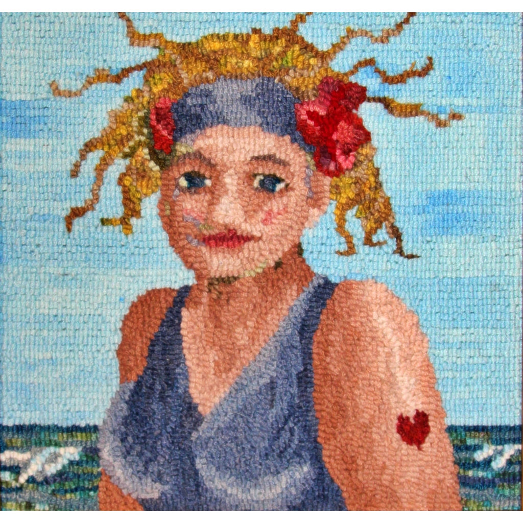 What's She Selling?, rug hooked by Beverly Mulcahy