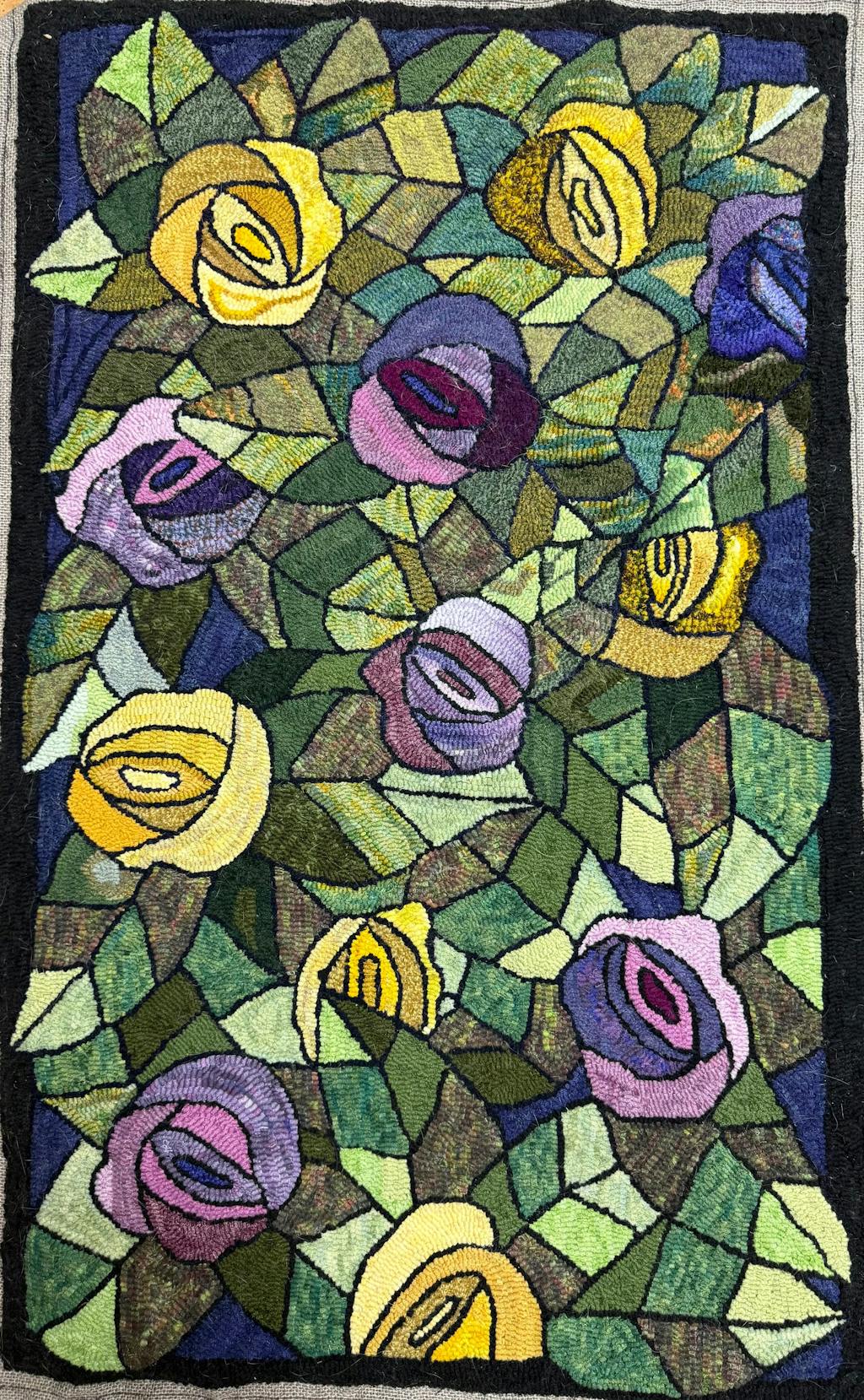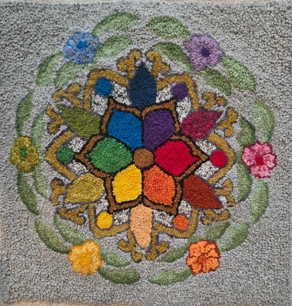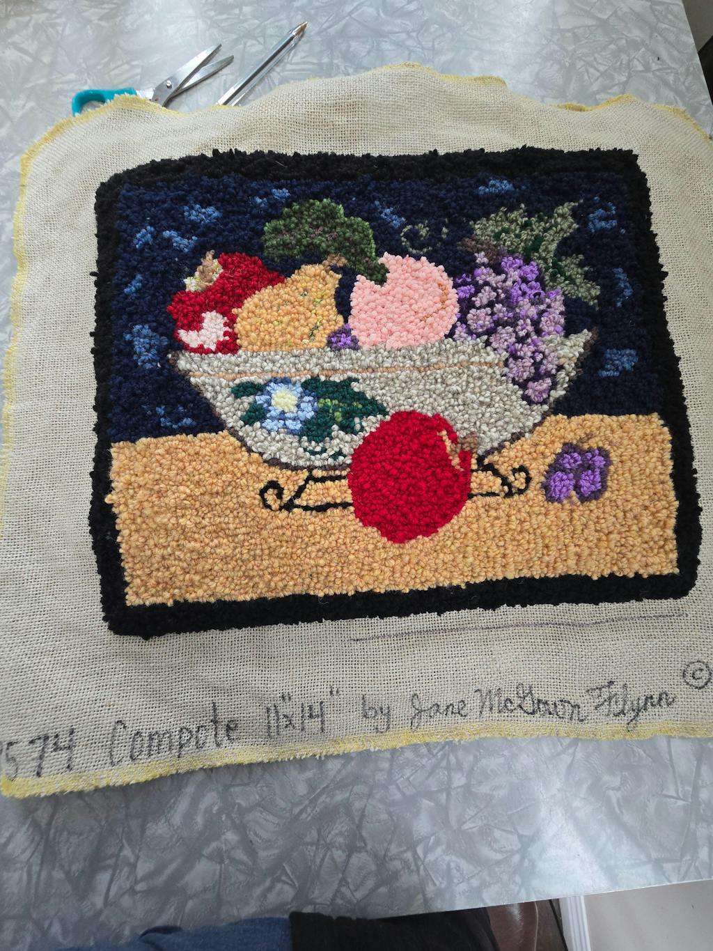Ok, it might have been a little ambitious to do for a first project, I had never picked up a rug hook in my life. The pattern was not exactly as pictured. There was flowers on the bowl and legs on the bowl that were a surprise but did them anyway. The peach color,shading was by far the hardest to do. I ended up using chenille which actually gave it some fuzzy texture. My friends at arts and crafts were surprised by what I accomplished on my own. At 71 you don't have time to waste, just jump in and do it. I am pretty happy with the results. The back is a mess, my fault, didn't know that you ended a piece on the top, so there are a lot of bits in back. No matter i will cover those sins with fabric.